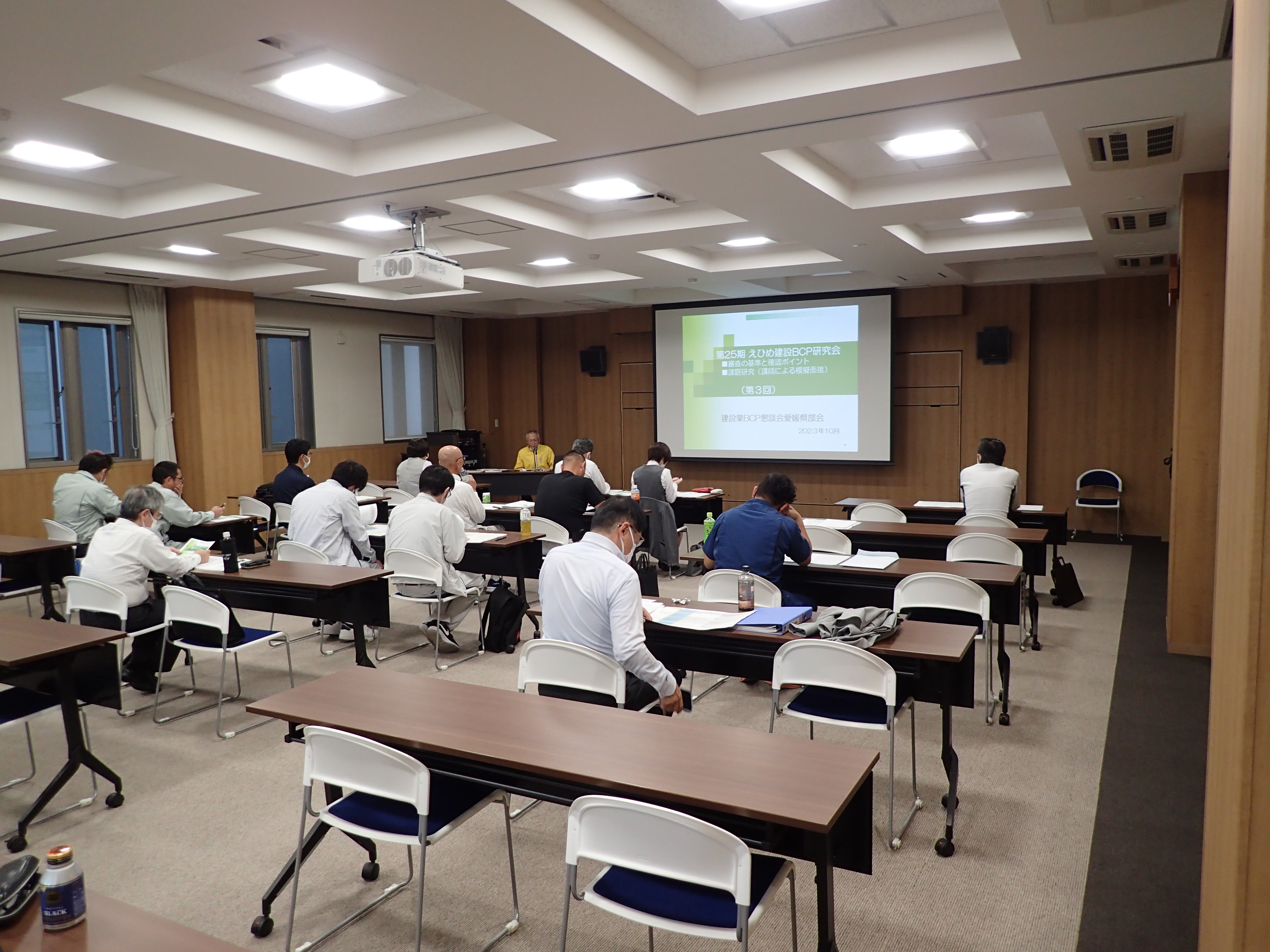 | 「第25期えひめ建設BCP研究会」が、8月30日から10月12日までの間、オンライン・東予・中予・南予の各会場で開催されました。(左写真は10月12日の松山建設会館における開催状況です。) |